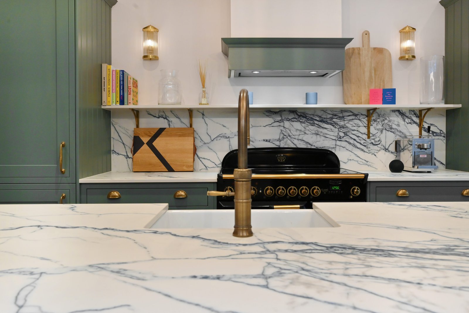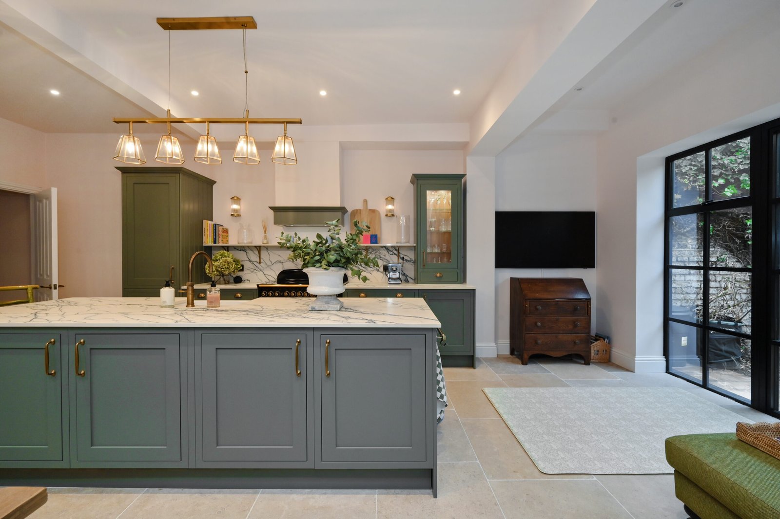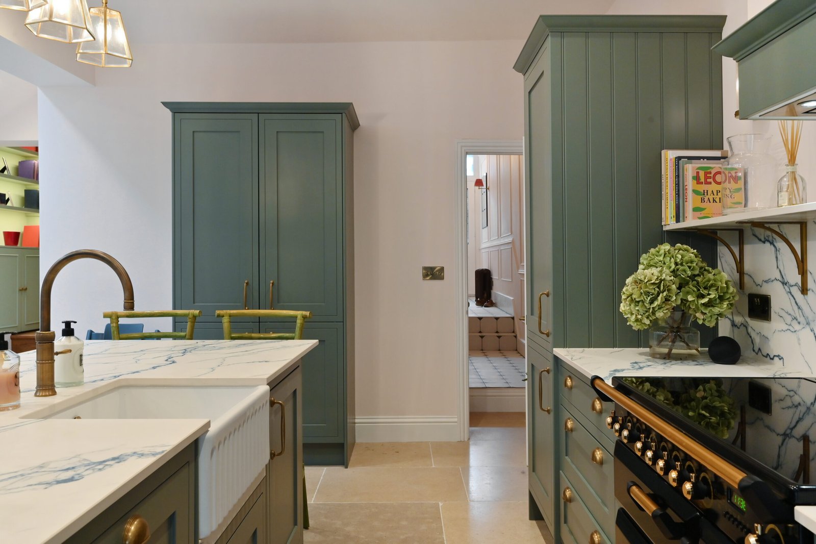 Ringmer Avenue showcases our signature kitchen design, featuring exquisite botanical green cabinetry complemented by rich, warm wood interiors.