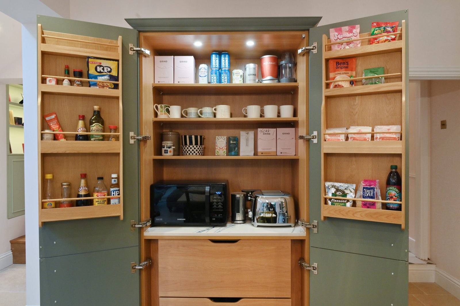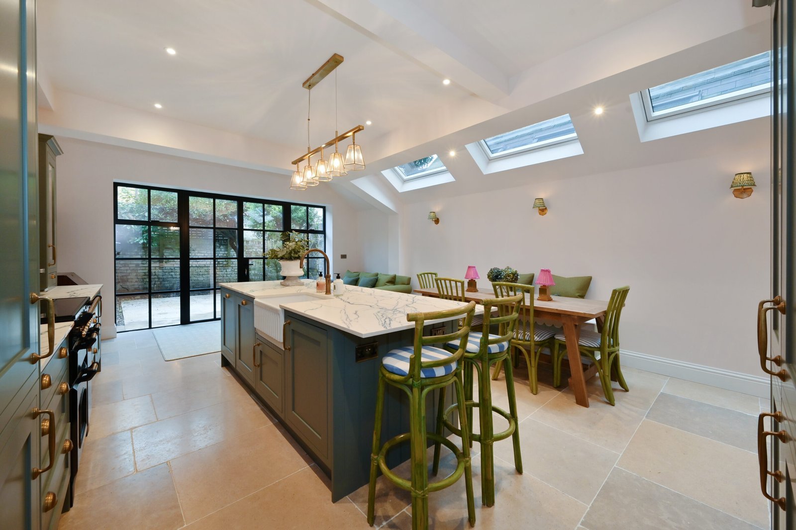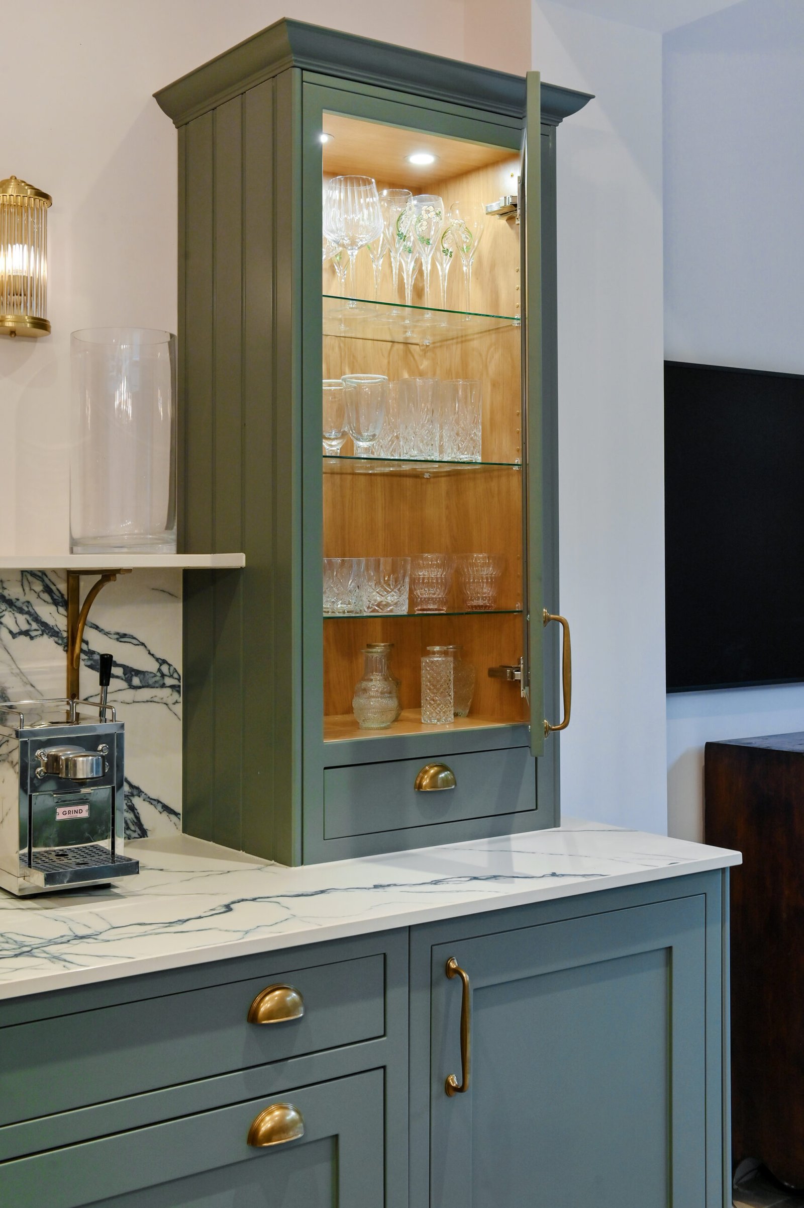 Ringmer Avenue showcases our signature kitchen design, featuring exquisite botanical green cabinetry complemented by rich, warm wood interiors.
