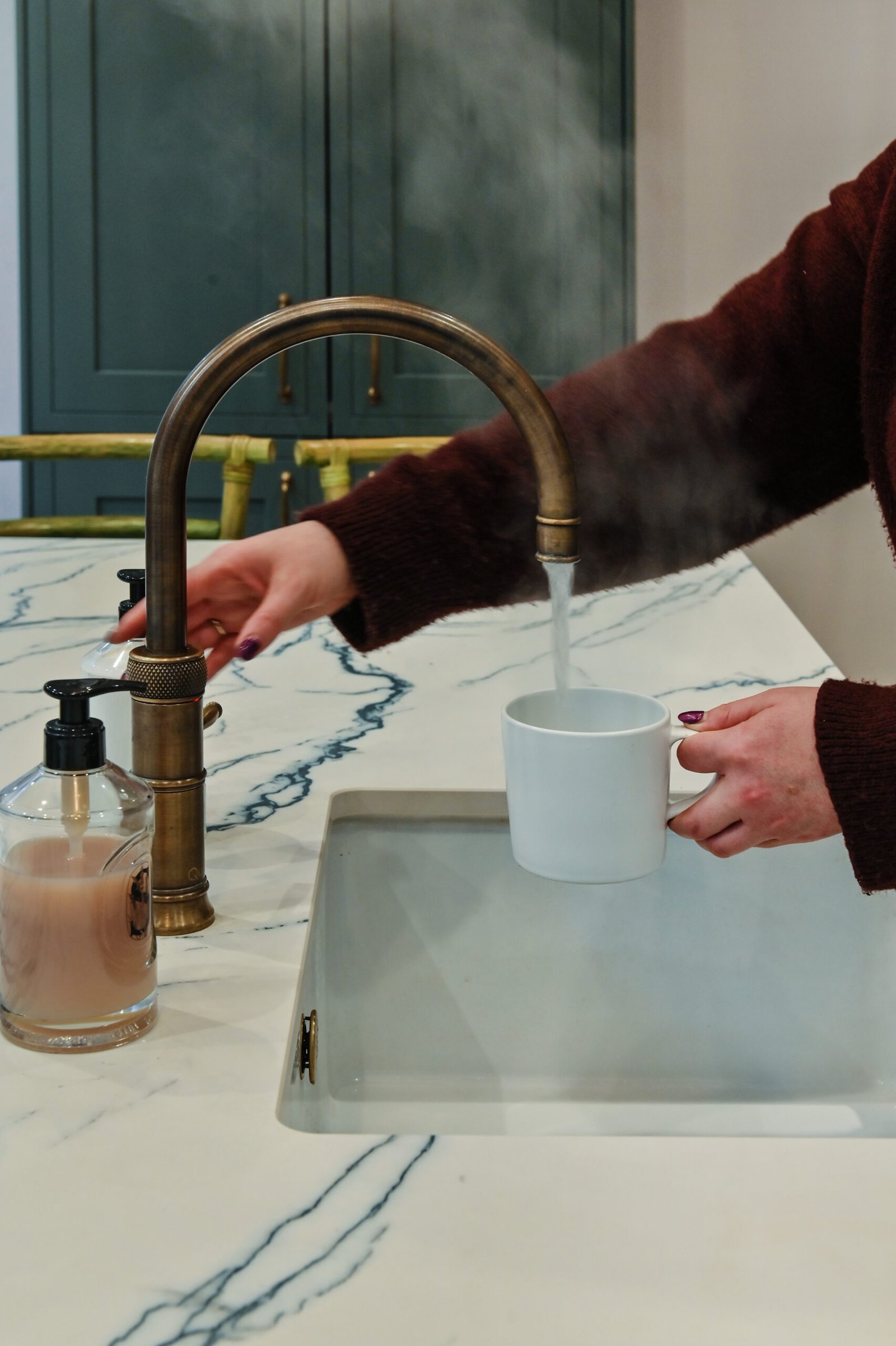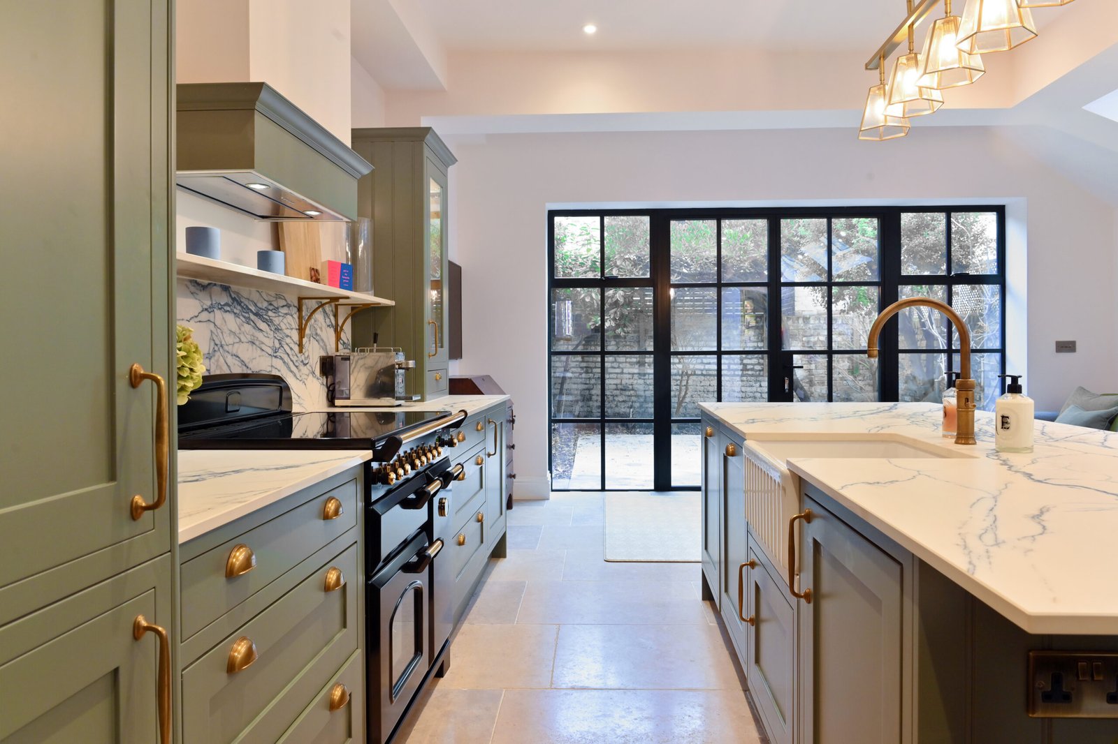 This bespoke English kitchen draws inspiration from traditional joinery, incorporating antique brass hardware, a spacious butler’s sink, and a classic patinated brass Quooker.